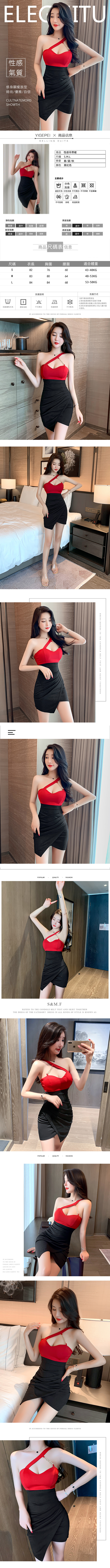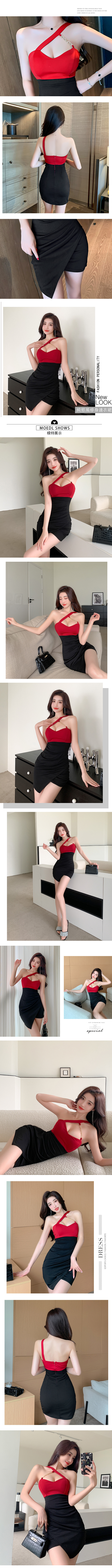 撞色開衩緊身包臀單肩吊帶不規則連身裙
