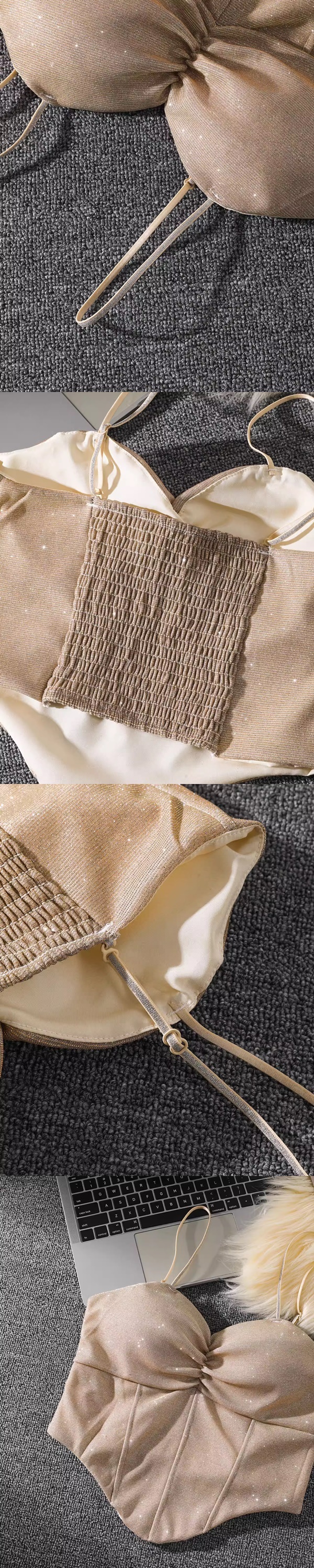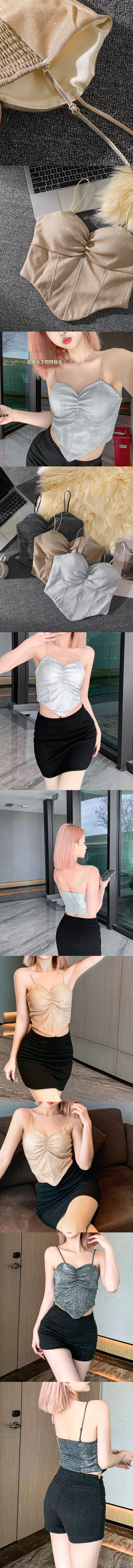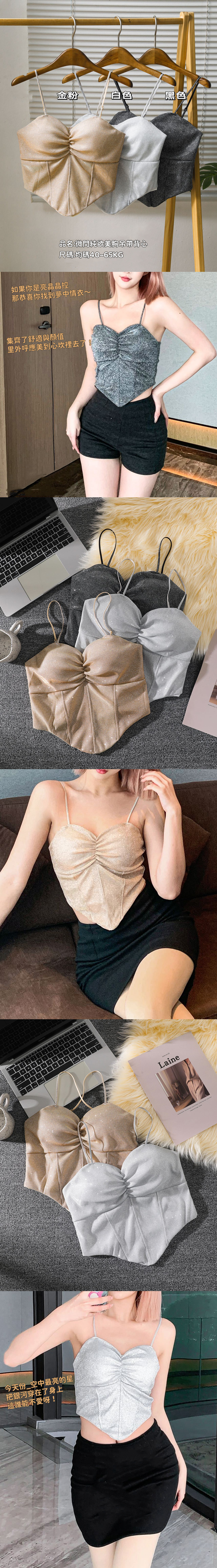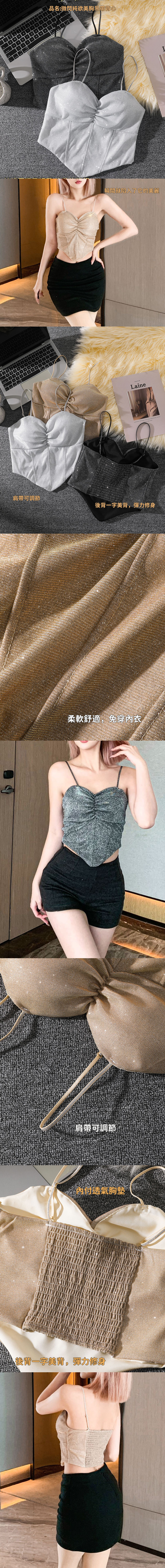 法式微閃帶胸墊固定杯深V純欲吊帶背心高彈褶皺閃粉內搭背心