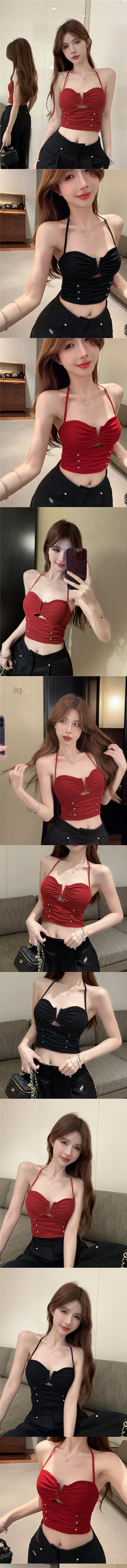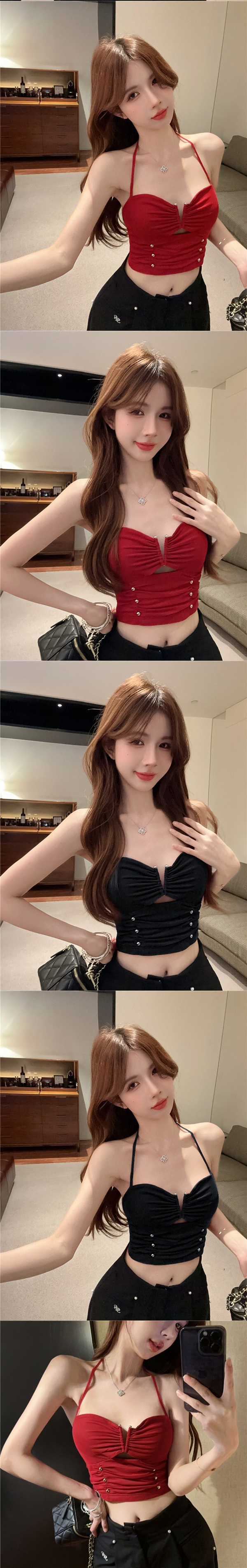 性感百搭鏤空小V掛脖綁帶短版背心
