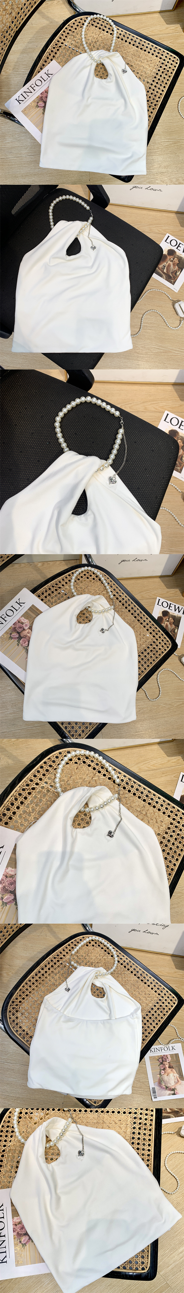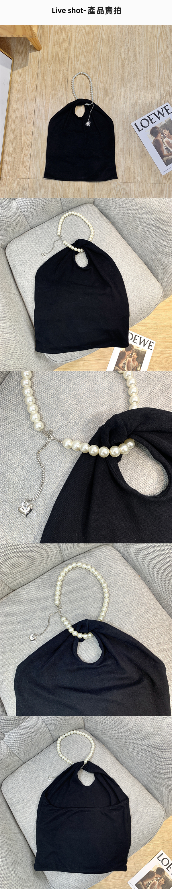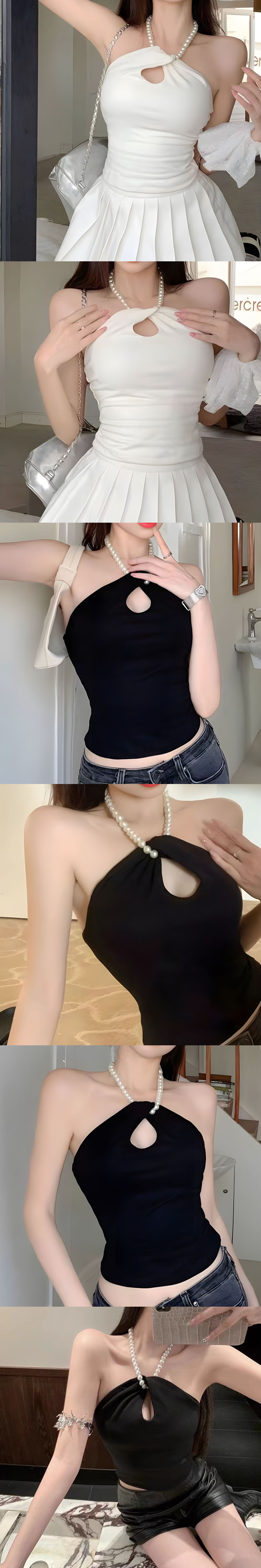 珍珠掛脖設計短款鏤空無袖百搭小可愛背心