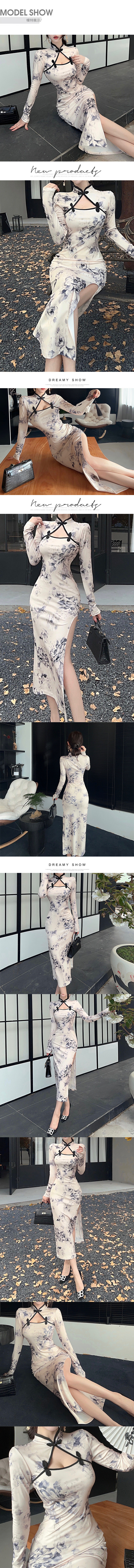 中大尺碼 新款改良復古印花鏤空開高叉性感修身長袖旗袍