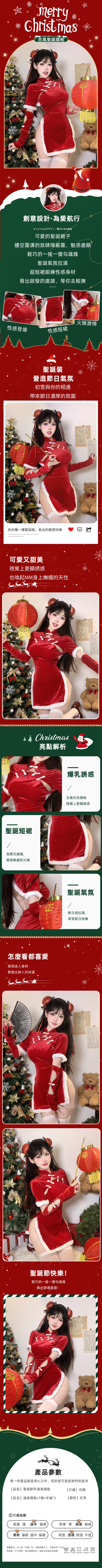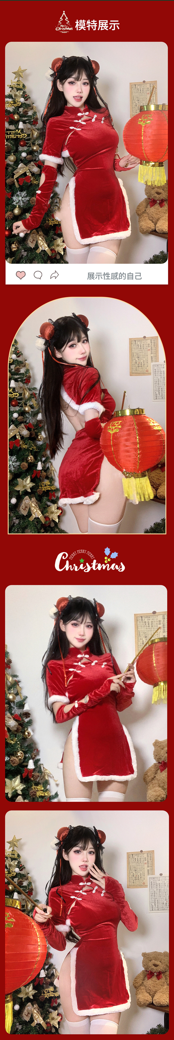 新年 聖誕 性感古風盤扣絨毛露背連身開叉旗袍三件組套裝