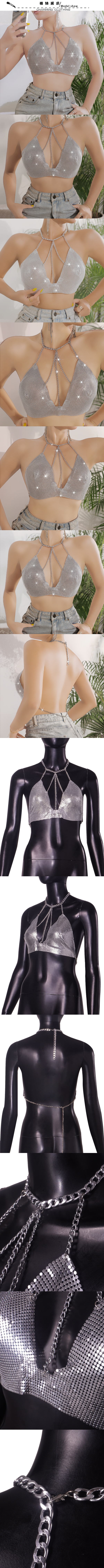 金屬掛脖鏈條露背閃亮性感心機誘人上衣