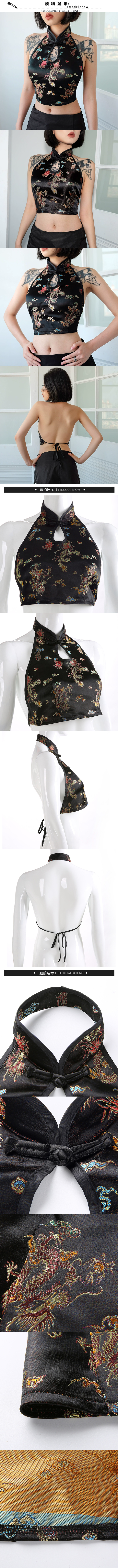 古風復古旗袍盤扣立領性感鏤空修身綁帶露背短版小背心