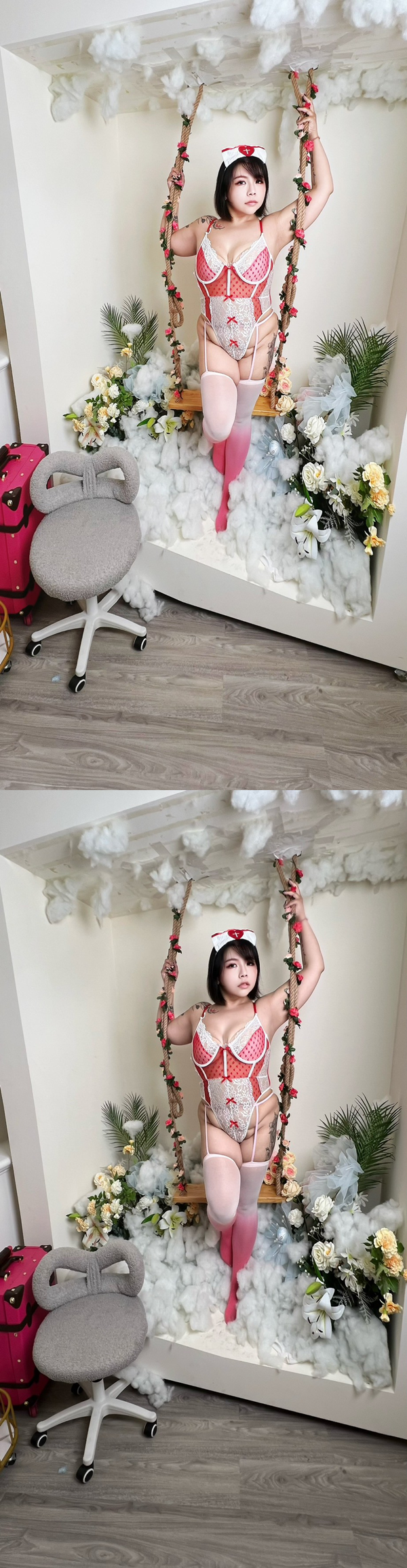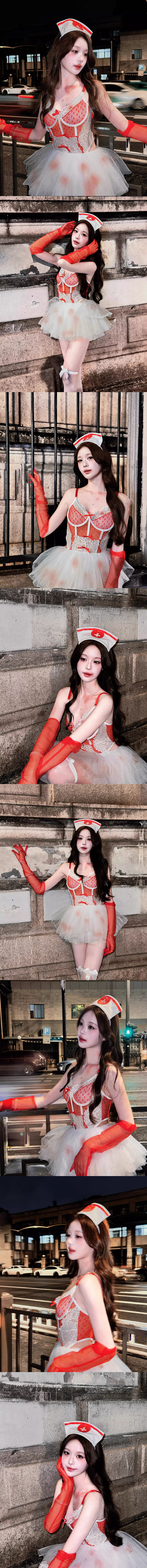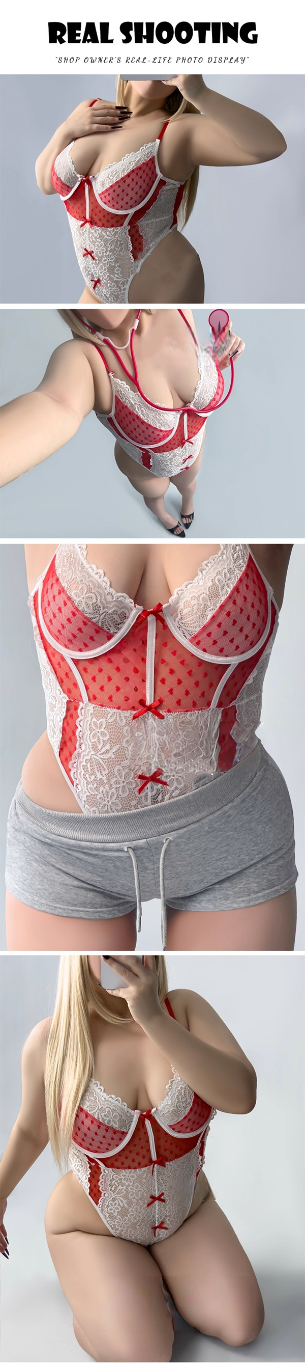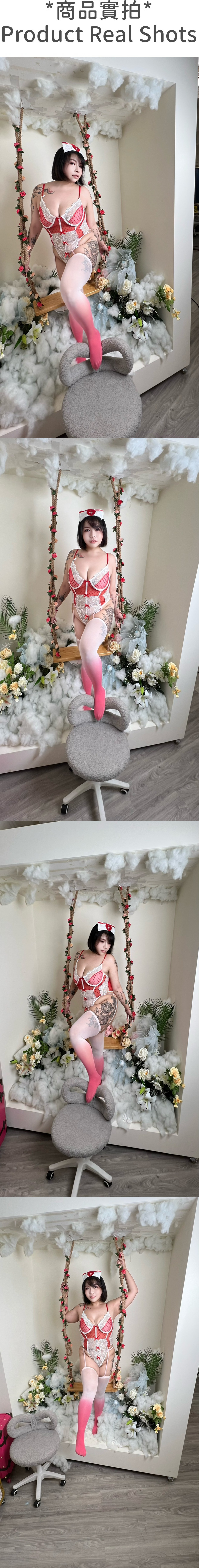 中大尺碼 法式浪漫蕾絲蝴蝶結護士暗扣開襠連身衣