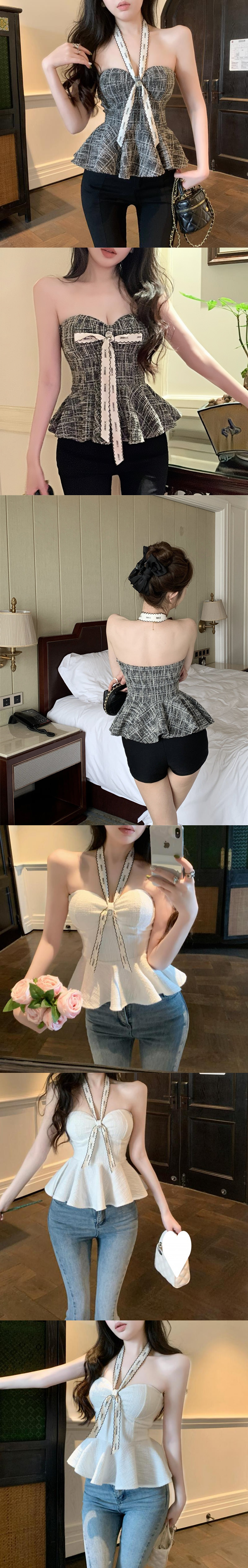 小香風兩穿掛脖荷葉邊抹胸帶胸墊顯瘦修身上衣