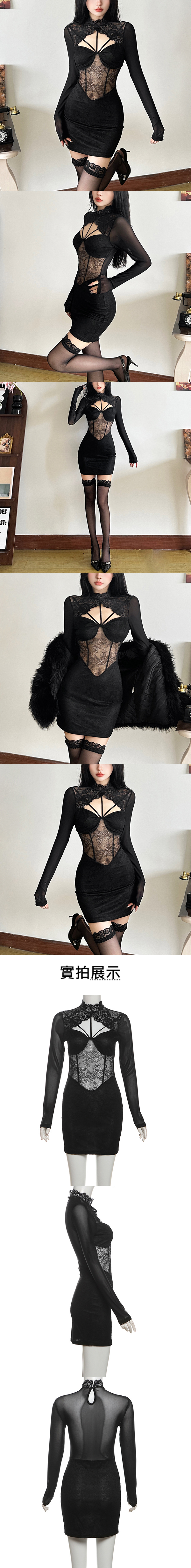 長袖網紗拼接蕾絲顯瘦遮肚包臀連身