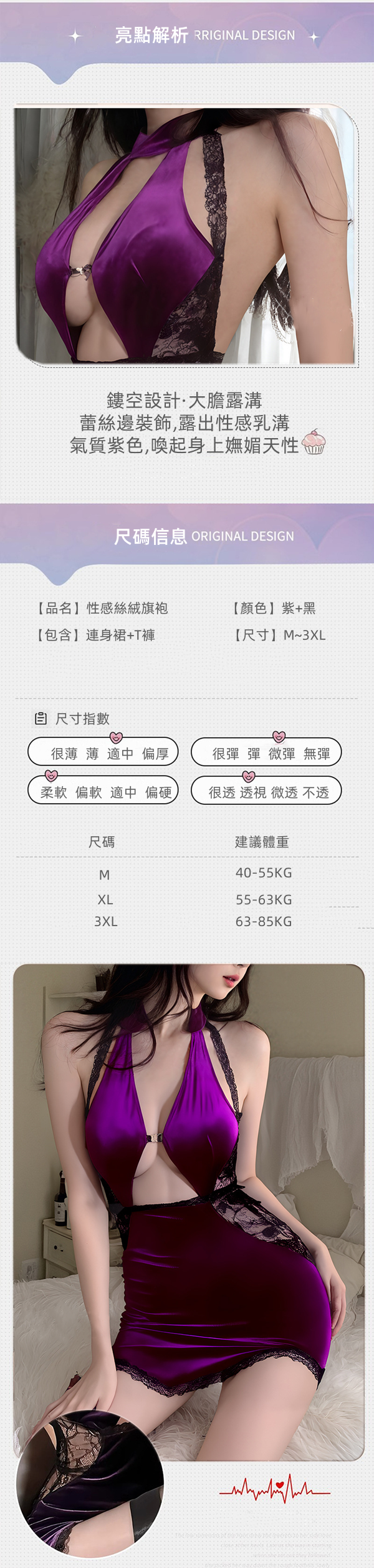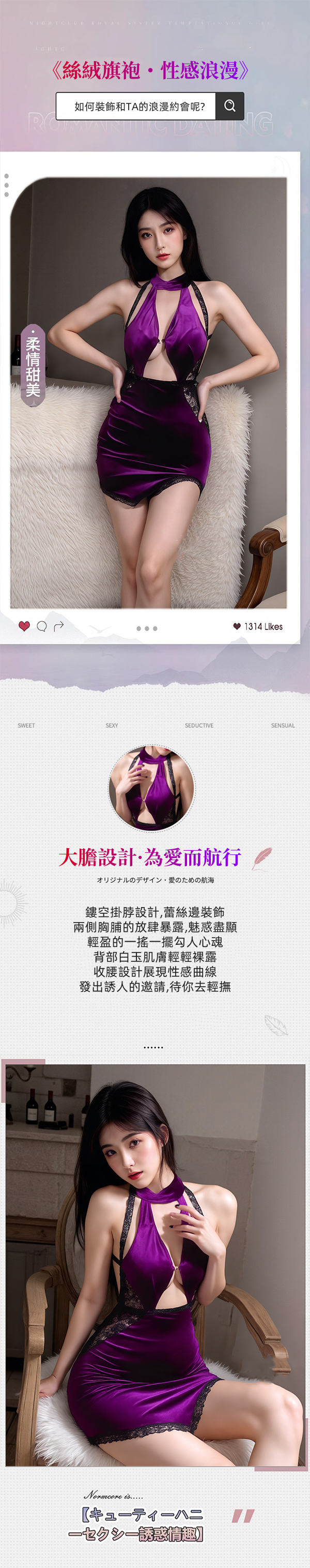 中大尺碼 性感鏤空蕾絲拼接掛脖絲絨連身裙