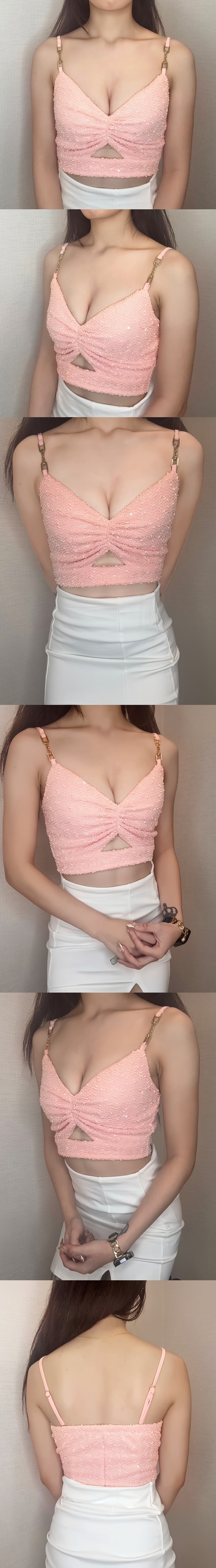 性感深V抓皺造型金屬肩帶毛粒馬甲禮服上衣