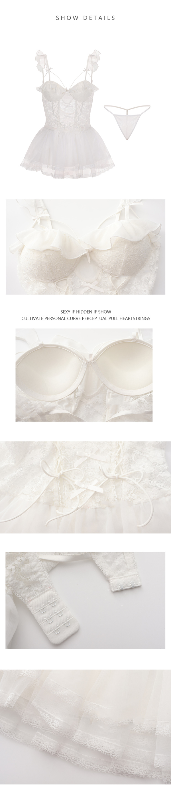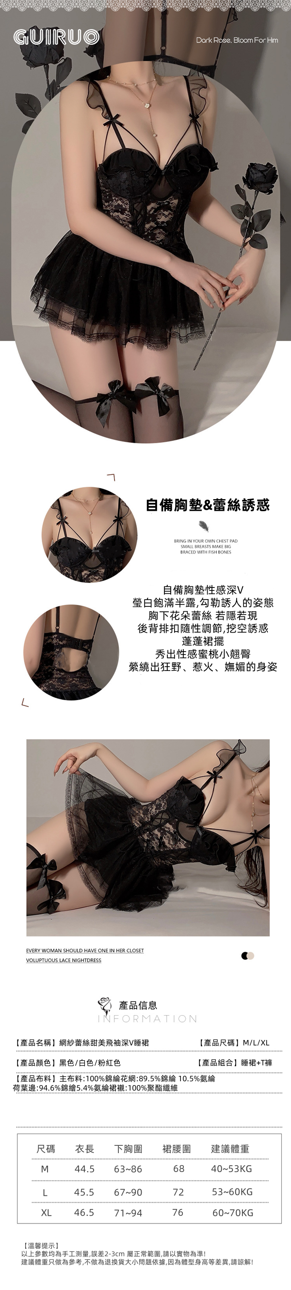 透視網紗蕾絲甜美飛袖深V帶胸墊連身睡裙