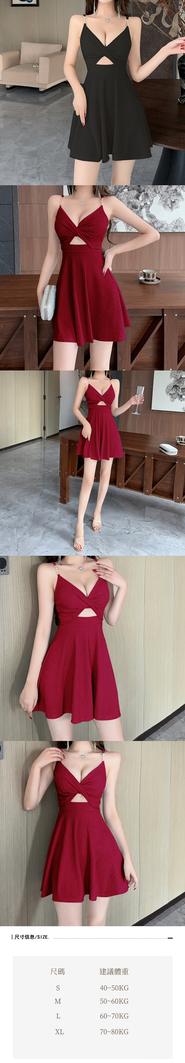 中大尺碼 性感深V鏤空鑽鍊吊帶傘裙洋裝