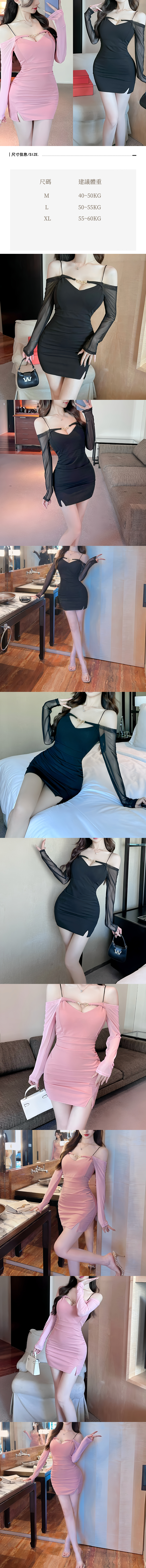 中大尺碼 性感低胸網紗拼接長袖露肩連身裙