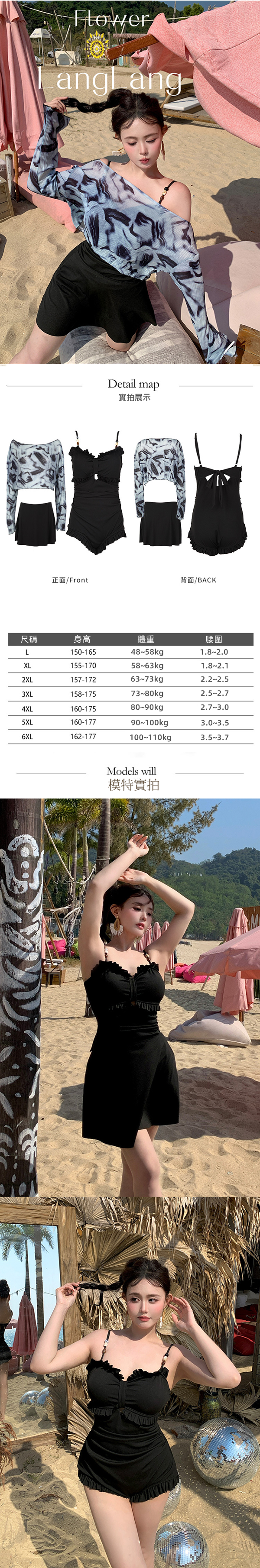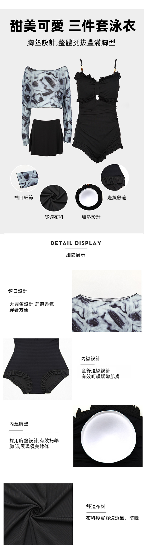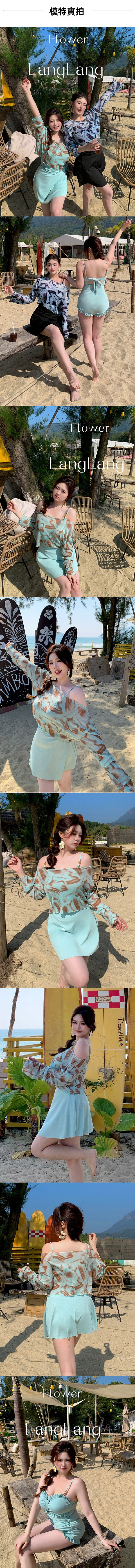 長袖防曬罩衫連身泳衣(含胸墊)遮肉顯瘦性感三件式溫泉泳裝