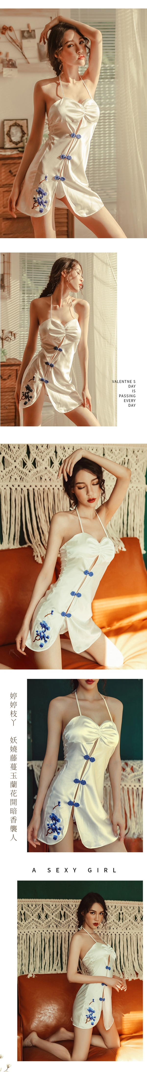 改良短旗袍 絲滑舒適掛脖連身弧形印花開叉顯瘦旗袍