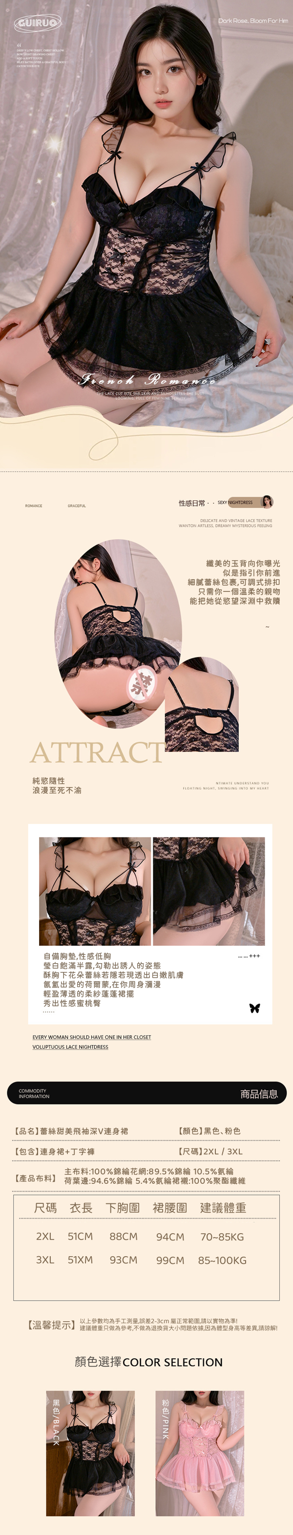中大尺碼 透視網紗蕾絲甜美飛袖深V帶胸墊連身睡裙
