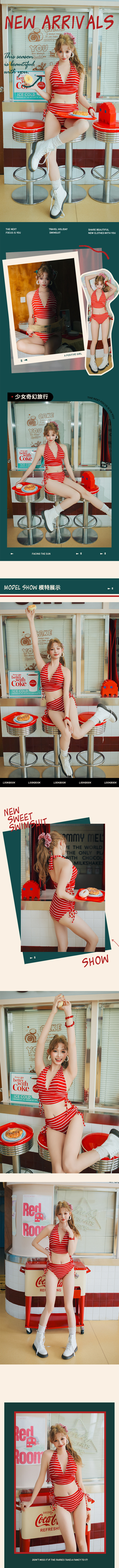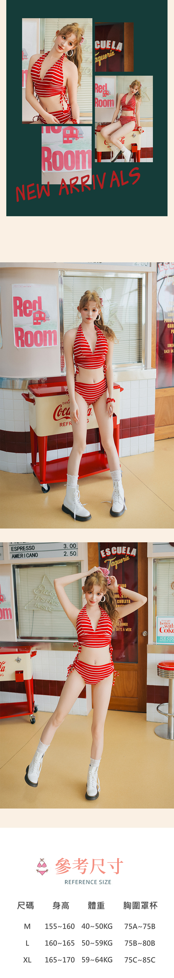 中大尺碼 掛脖抽繩條紋復古韓版泳衣