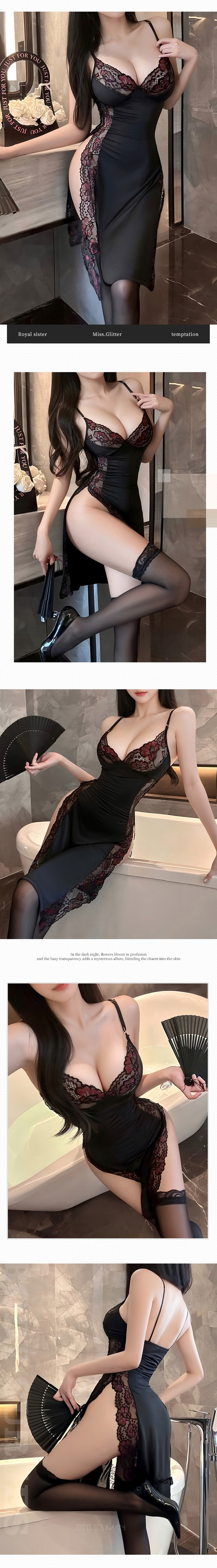 中大尺碼 性感開叉蕾絲性感吊帶長裙