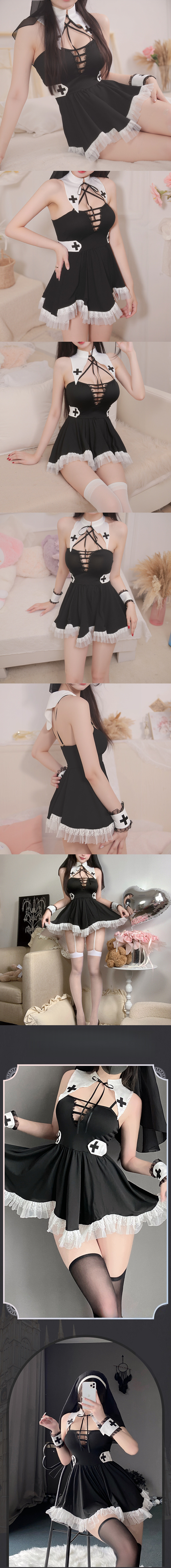 中大尺碼 萬聖節 cosplay 性感禁忌修女削肩顯瘦連身五件組套裝