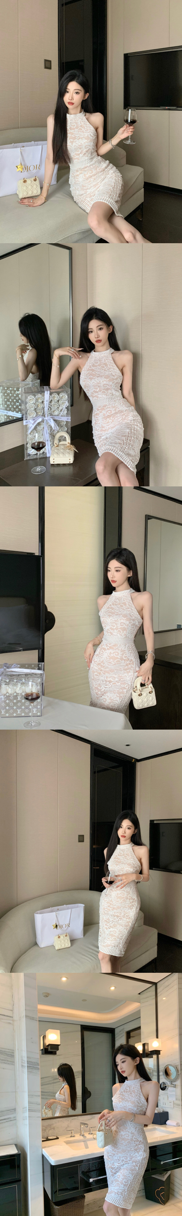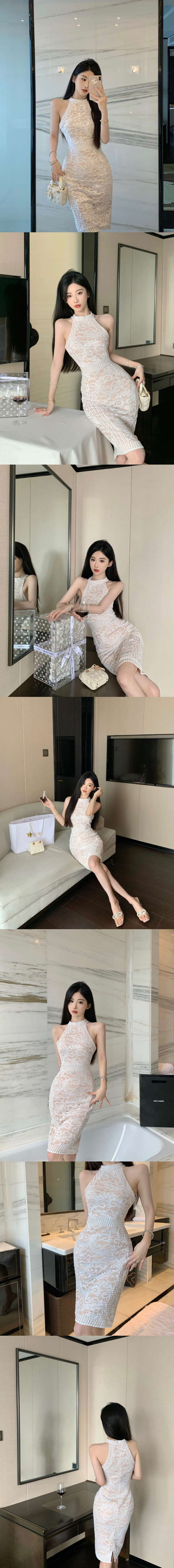 睫毛蕾絲花邊修身削肩連身包臀長裙