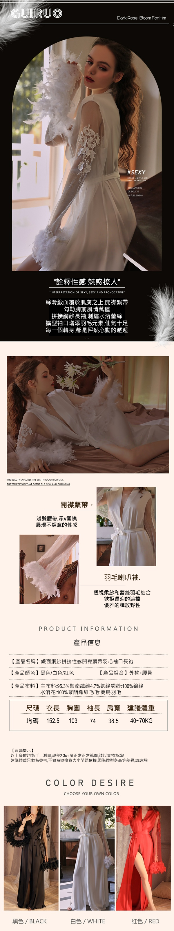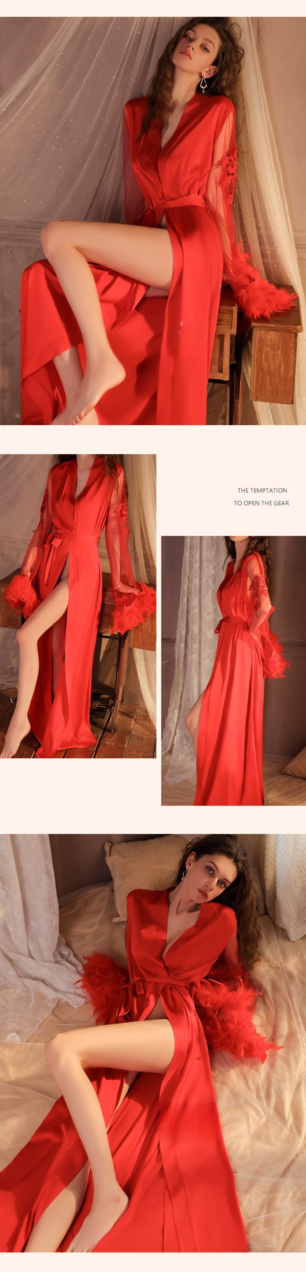 40~70KG 可穿 唯美緞面網紗拼接性感純欲带羽毛袖口長睡袍
