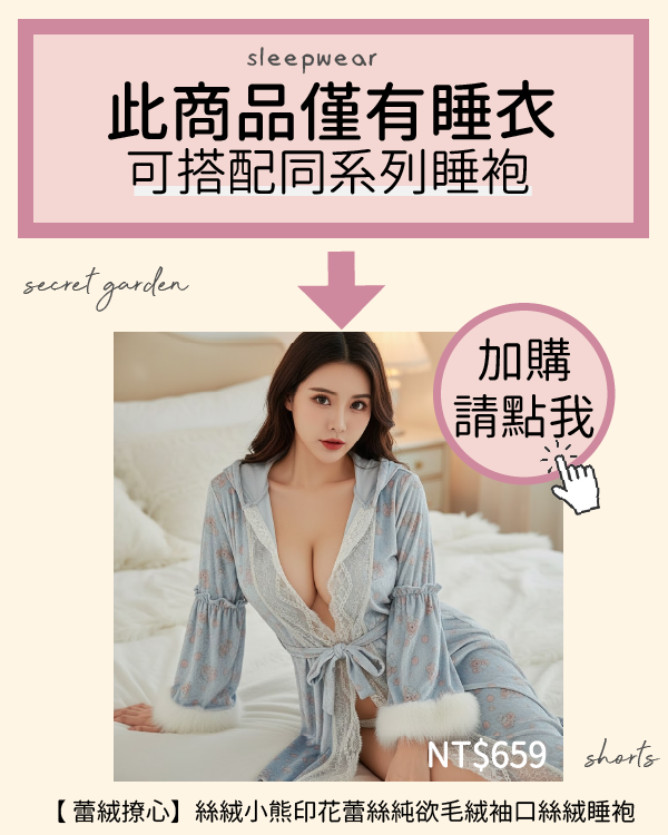 絲絨可爱小熊印花深V胸墊蕾絲聚攏兩件式絲絨睡衣套裝