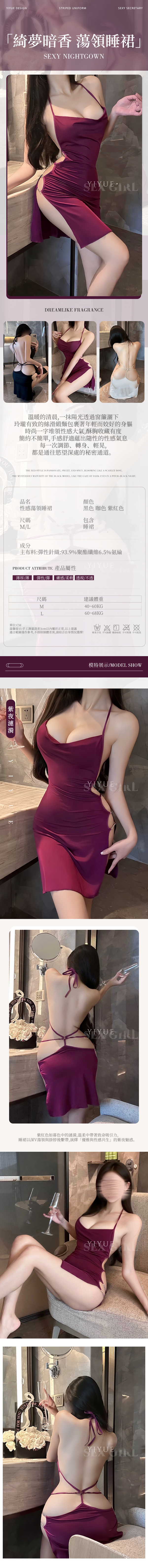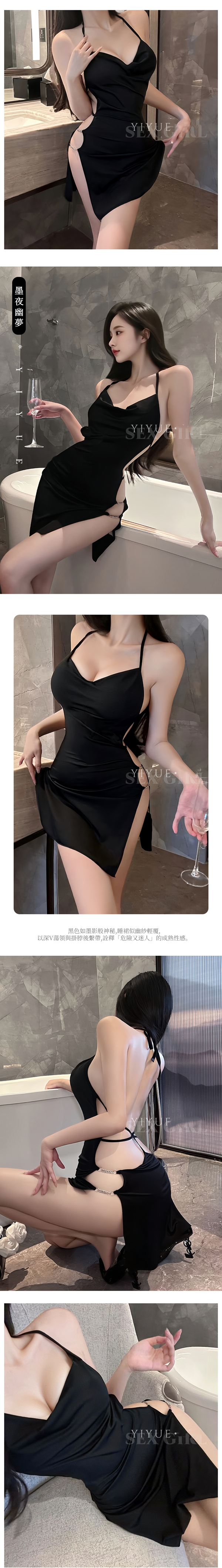 性感掛脖露背側開叉鏤空綁帶連身火辣睡裙