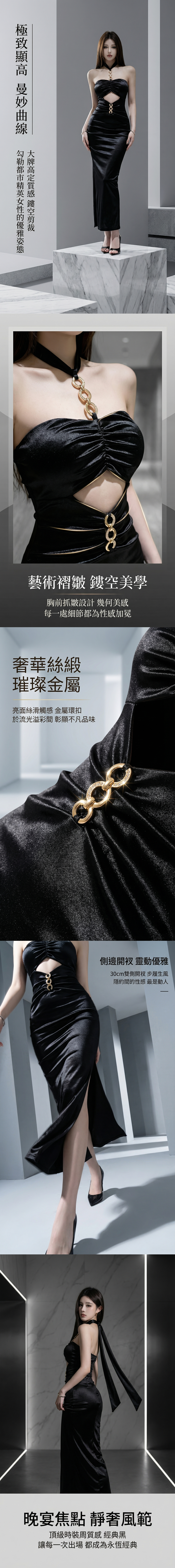 夜店辣妹裝【黑緞映影】M~L 御姐風性感鏤空掛脖金屬鏈條黑色亮面收腰連身長裙012285