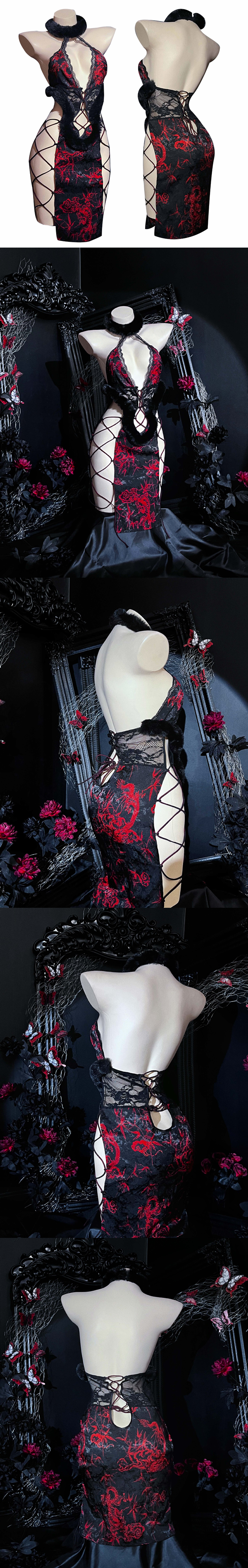 新款改良美杜莎掛脖鏤空綁帶黑紅性感連身旗袍