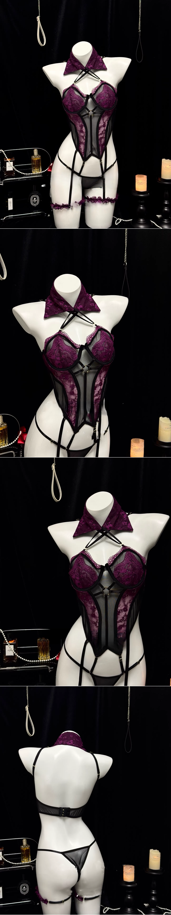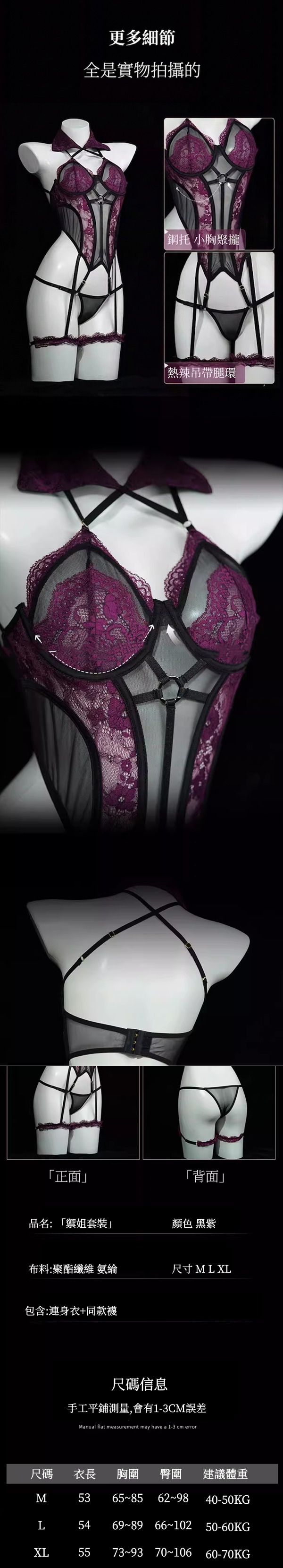 紫魅性感純感蕾絲透視網紗交叉連身馬甲套裝