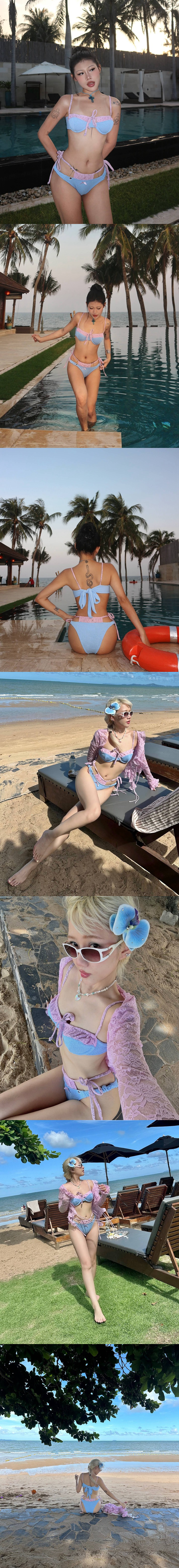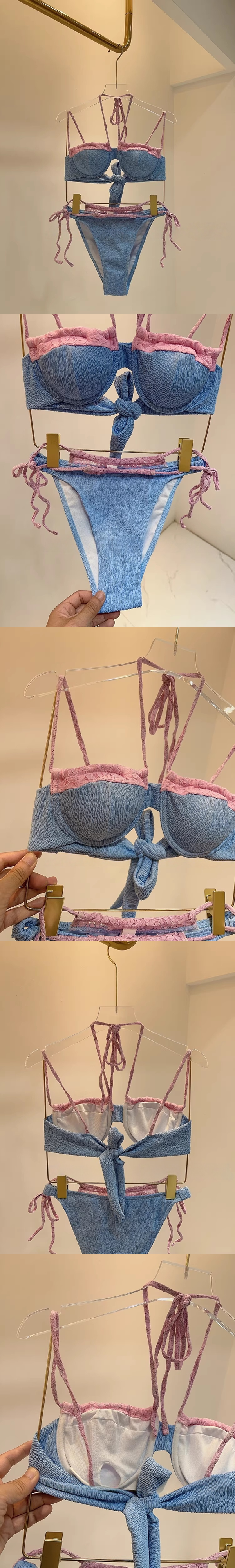 夏日甜美辣妹粉藍撞色蕾絲雙褲頭網美拍照鋼圈泳裝