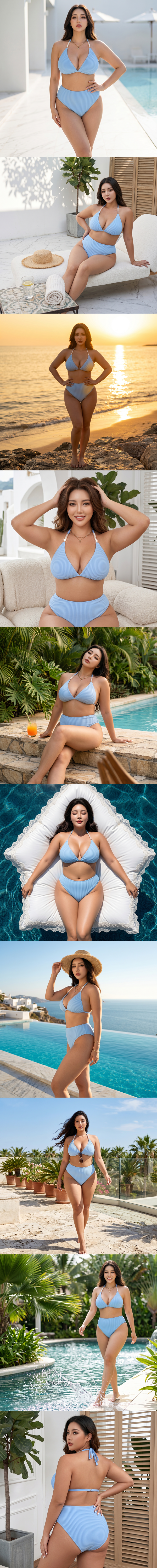 棉花糖女孩專屬 珍珠掛脖綁繩純色高腰性感分體泳裝