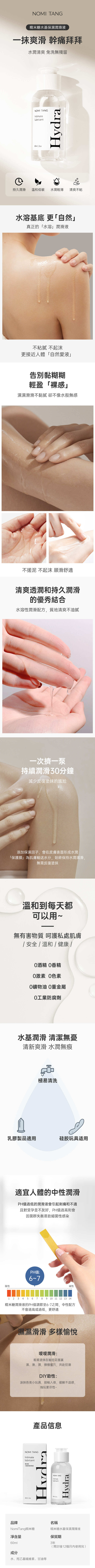 Nomi Tang 的 Hydra Intimate Lubricant 糯米糖保濕潤滑液,使用水性基底,水潤清爽,使用感濕滑而不黏膩,真正的[裸感]。不含香料、色素、酒精、激素及其他有害的添加劑,亦能配合安全套或其他矽膠玩具一同使用。