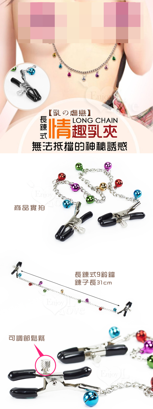 每個乳夾下方有閃亮的掛鍊連著小巧可愛的彩色小鈴鐺,乳夾在乳頭上,可以左右搖擺產生視覺刺激,並且發出性感的聲音,作為乳飾乳夾絕對是一款創新的產品。試想一下,在男歡女愛的時候,掛鍊上的小乳鐺搖來擺去,又是一番什麼樣的情趣呢......