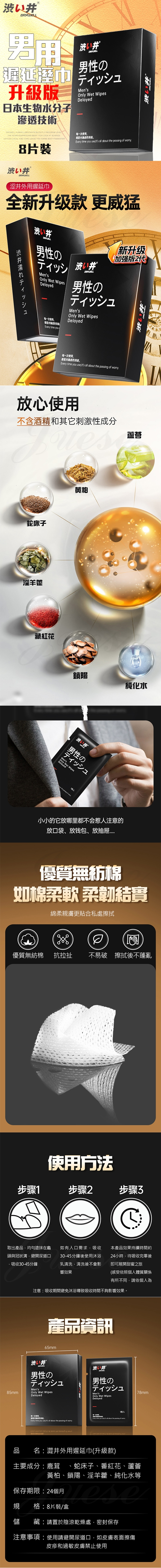 專為男性打造的外用型加強濕巾,全新升級配方,穩定表現更進階。清爽水潤質地,輕輕擦拭即可使用,溫和調理不刺激,幫助提升耐受度與節奏掌控力,讓關鍵時刻更持久、更有自信。