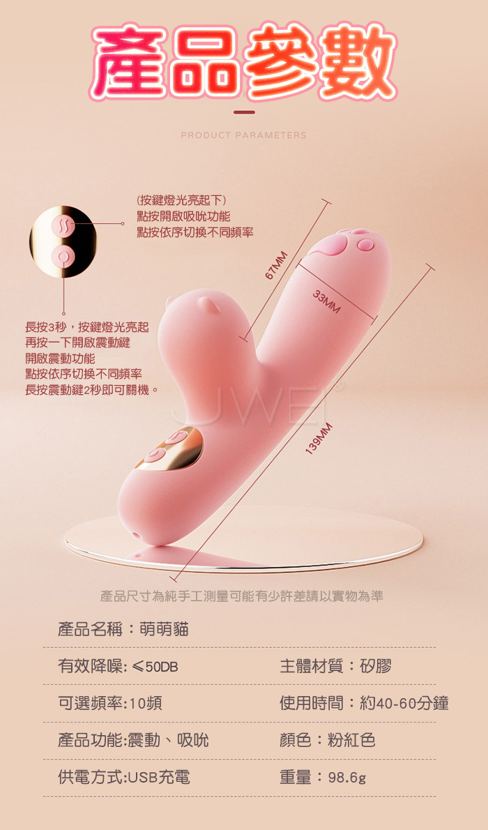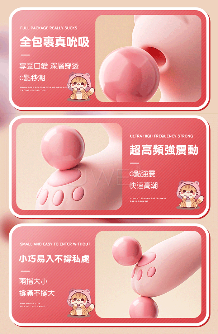 小巧輕便,適合隨身攜帶;10頻震動結合吮吸功能,針對G點高效刺激;USB充電環保方便,設計可愛低調,滿足私密需求。