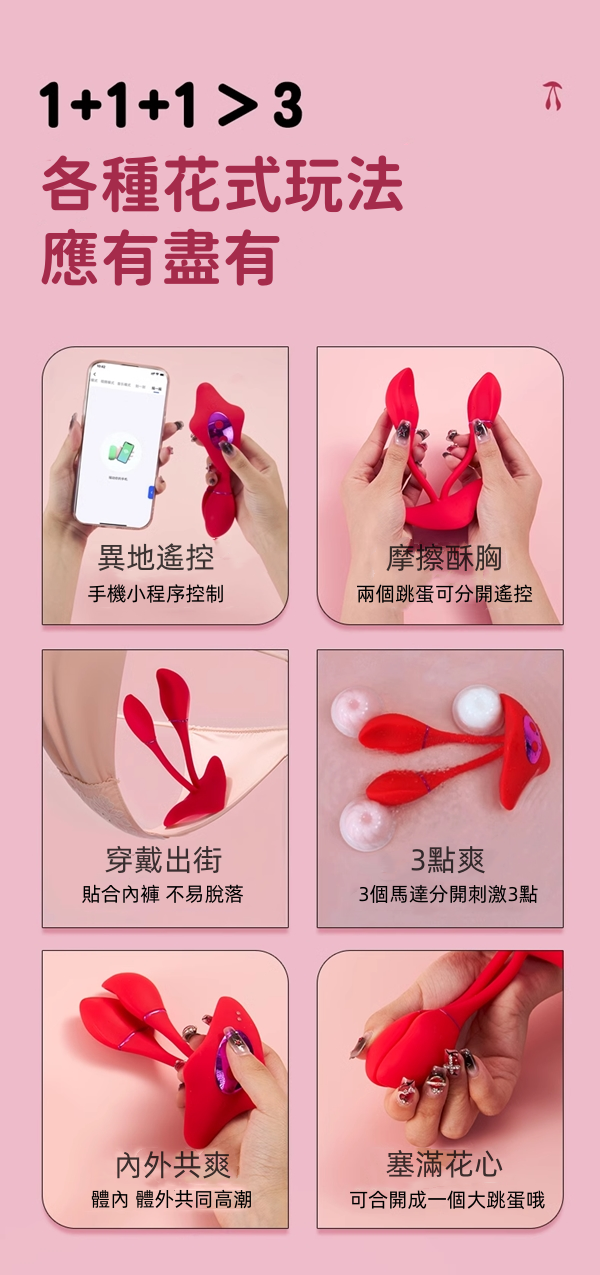 三點同震,刺激升級!這款APP遙控跳蛋擁有9種變頻震動模式,結合三重震源設計,貼合敏感地帶、全面激發快感。隱形穿戴、靜音設計,無論外出約會還是居家獨享都毫無壓力。支援APP遠端操控,讓情趣跨越距離,享受雙人調情樂趣。USB磁吸充電,方便又快速,是妳的貼身祕密武器。