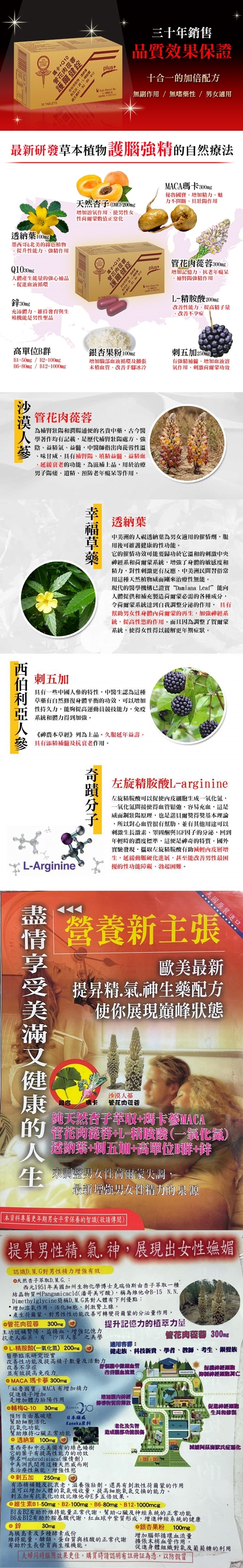 三十年銷售,品質效果保證! 十加一配方,添加多種草本植物,結合三大營養素! 讓您經常精力充沛,常保魅力自信!