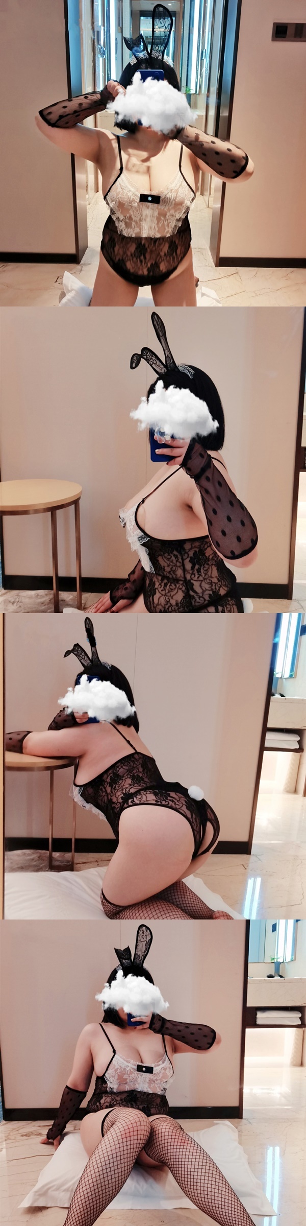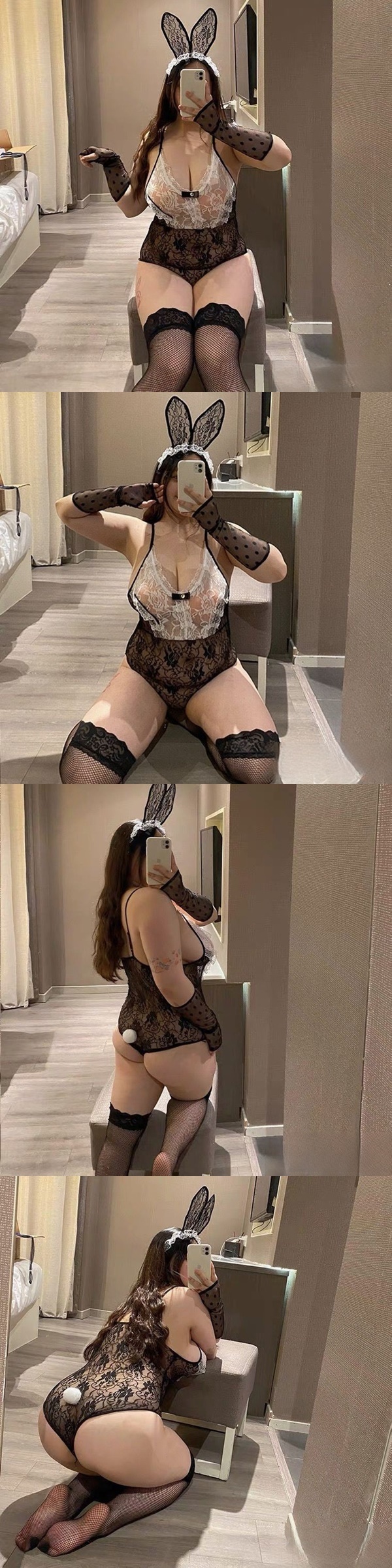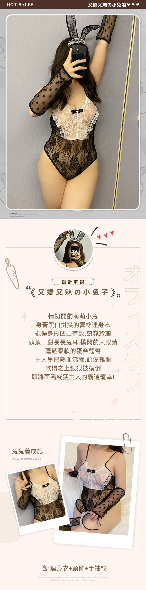 中大尺碼透視黑緹花蕾絲兔女郎情趣連身衣角色服(連身衣x1+頭飾x1+手袖x1)