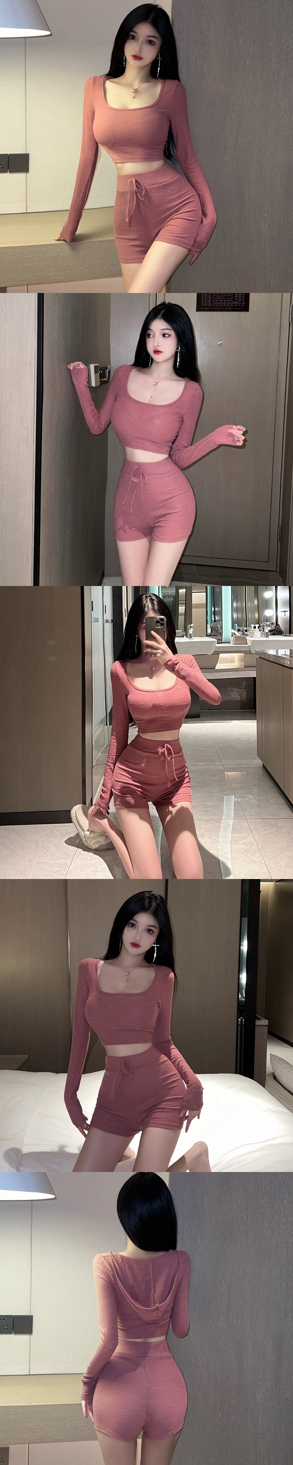 性感U領短款連帽上衣+高腰短褲運動套裝