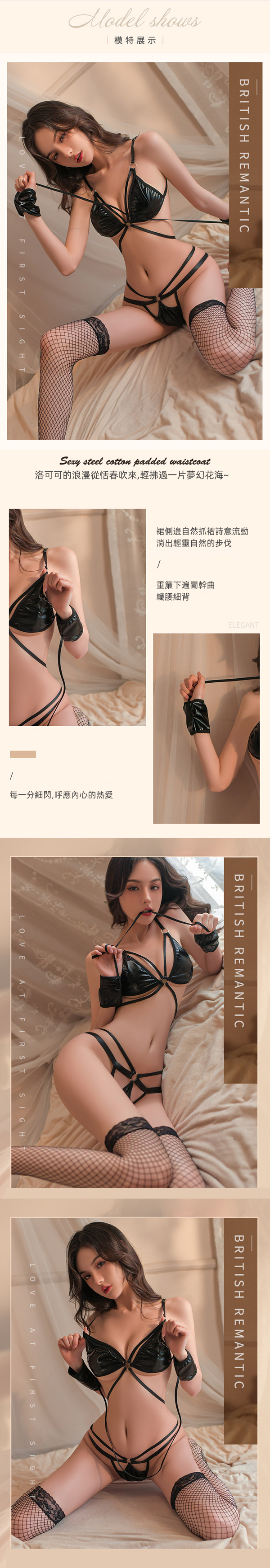 狂野捆綁漆皮三點式套裝三件組(文胸+內褲+手銬含牽引繩)