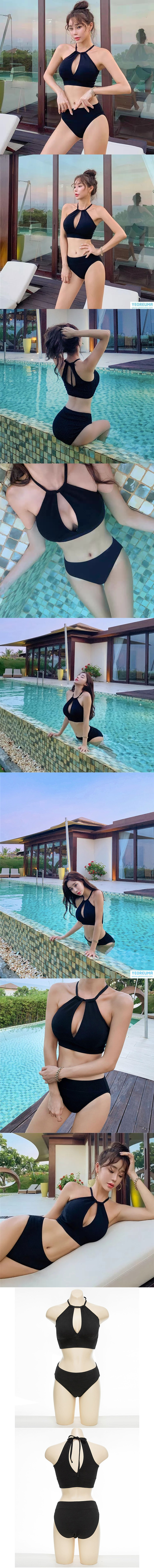 中大尺碼 性感掛脖修身聚攏鏤空比基尼