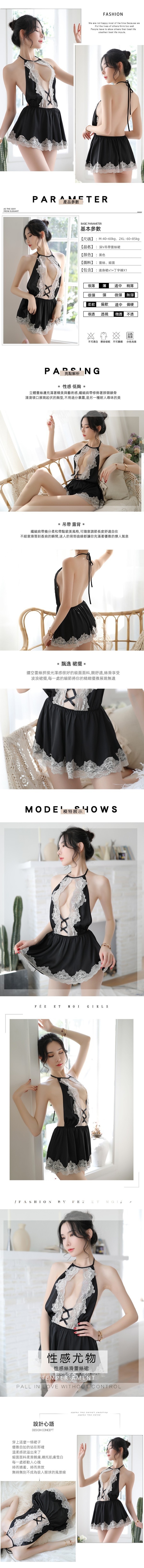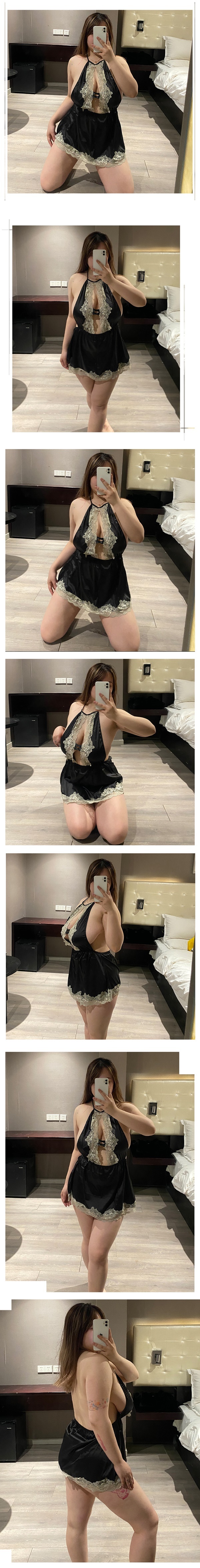 中大尺碼 掛脖露背鏤空緞面蕾絲睡裙
