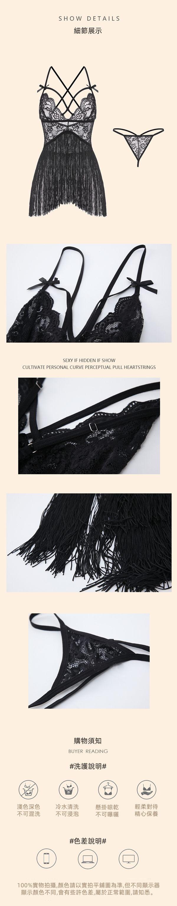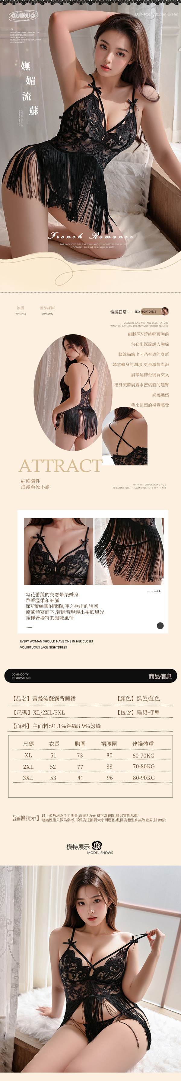 中大尺碼 性感透視蕾絲流蘇露背睡裙