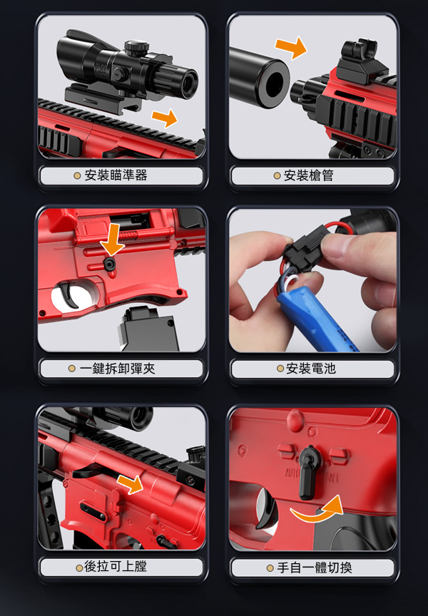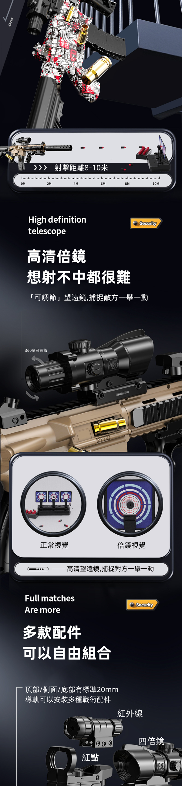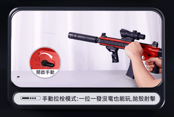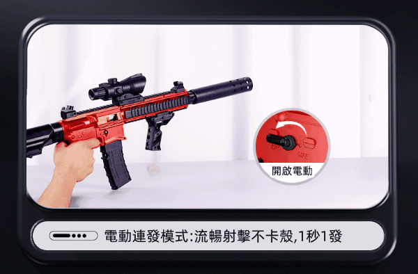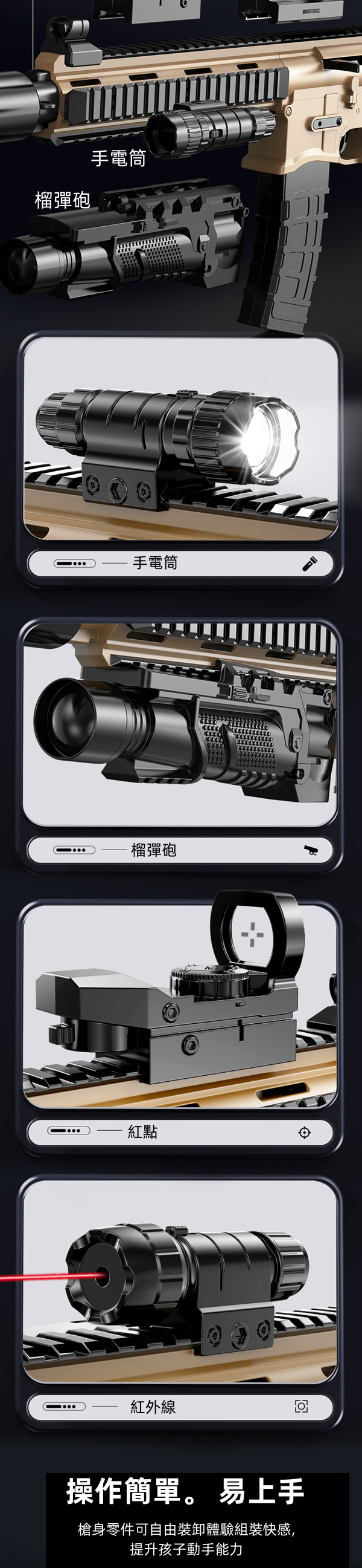 ■內容物:倍鏡+握把+背帶+彈夾+彈殼*8+軟彈*10+充電套裝+紅外線+手電筒