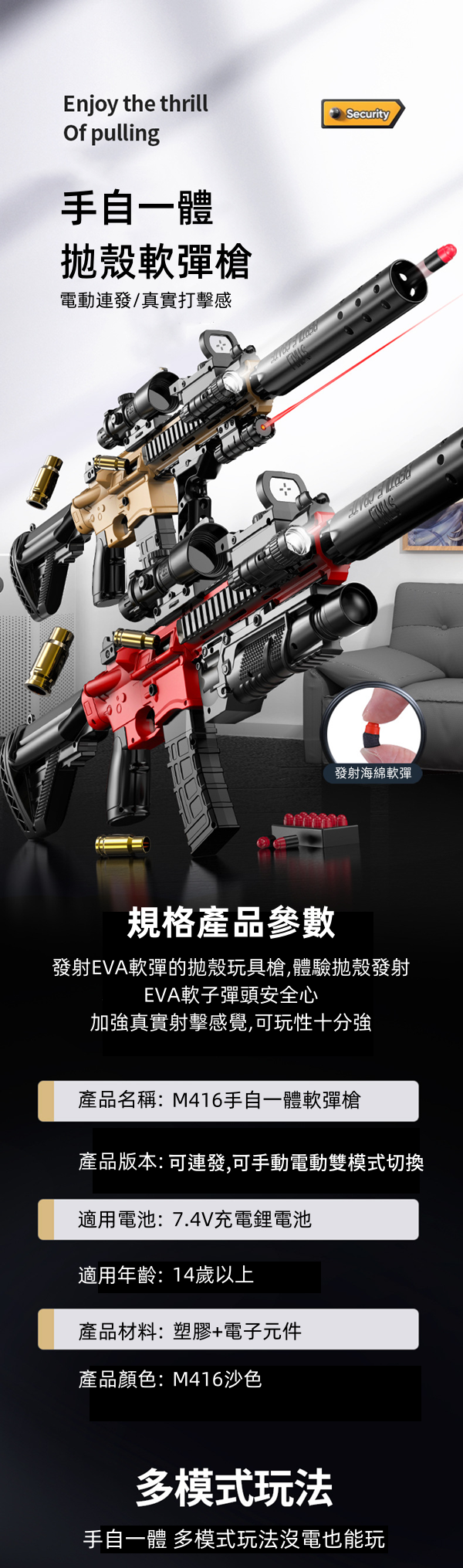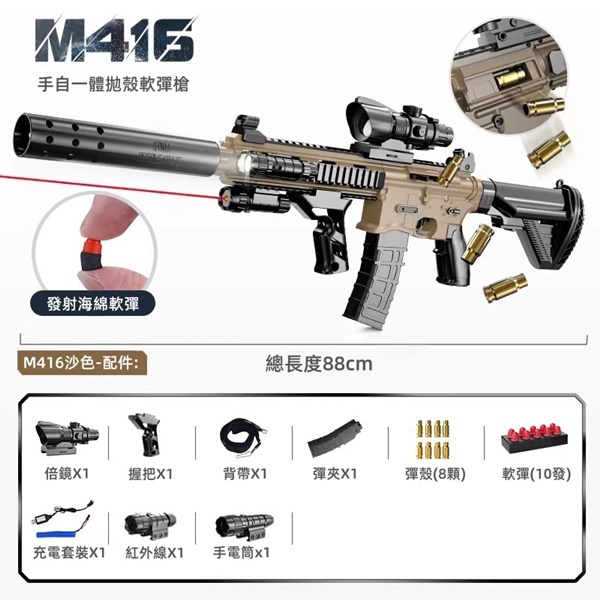 手自一體M416拋殼軟彈電動連發高配手電筒紅外線玩具槍