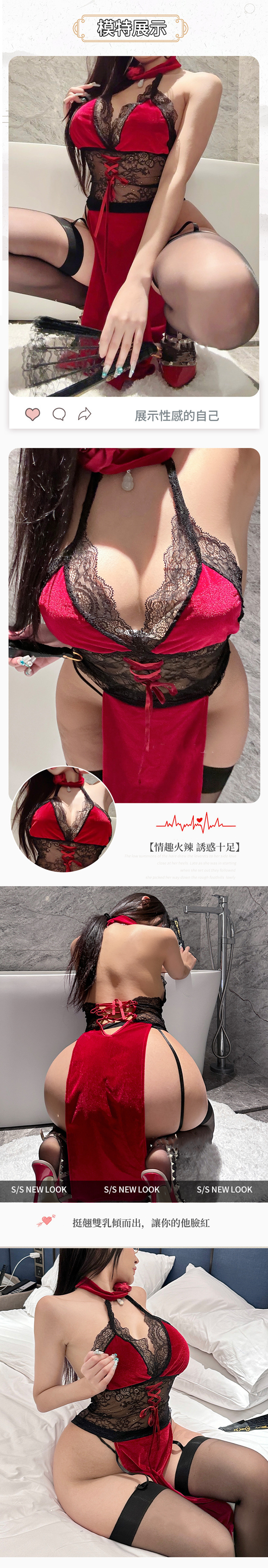 絲絨高腰開叉中國風性感蕾絲旗袍