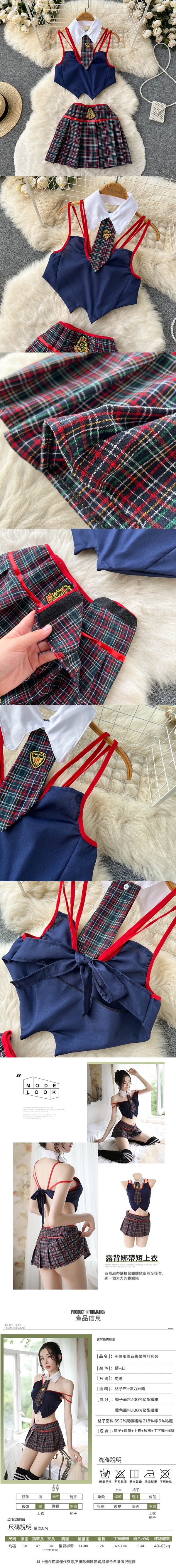 ■商品內容:英倫風露背綁帶設計套裝六件組(領子+領帶+上衣+短裙+丁字褲+棉襪)