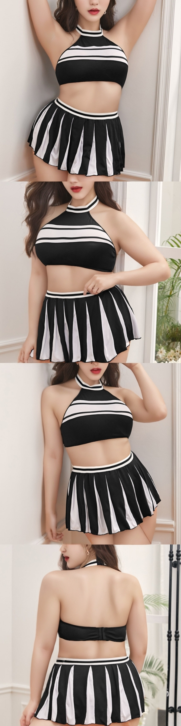 中大尺碼 掛脖皺褶條紋格子拉拉隊兩件式套裝