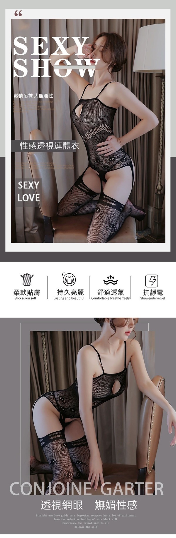 ◆商品內容: 提花吊帶鏤空網狀蕾絲連身貓裝 (不含丁字褲)