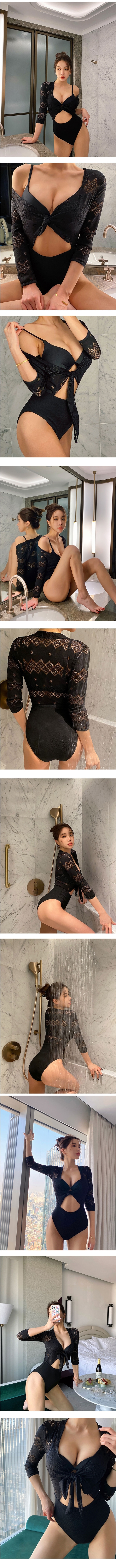 韓版拼接蕾絲長袖連身泳裝(鋼圈/胸墊)